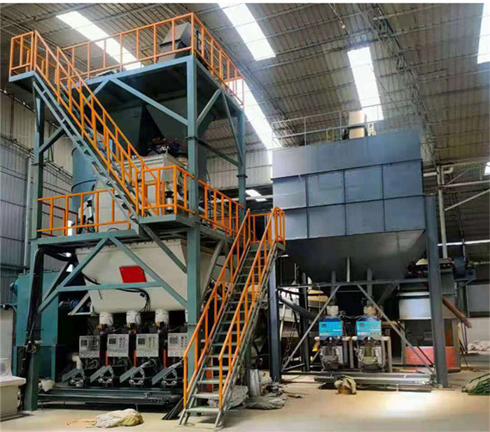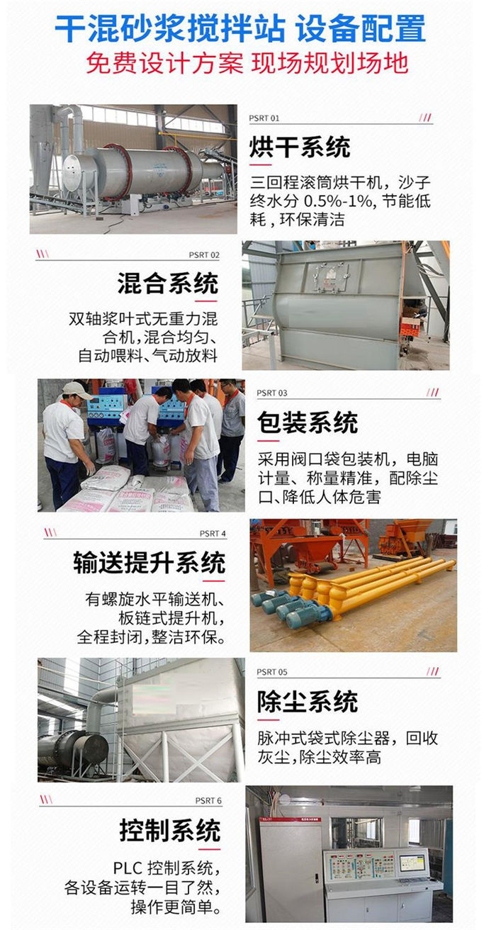 該套生產線由砂子烘干系統及預拌砂漿混合系統兩部分組成。主要包含:砂子烘干系統、篩分輸送系統、原料儲存系統、高效混合系統、自動配料系統、氣動平衡系統、除塵系統、袋式包裝系統、散裝罐車專業包裝系統以及PLC自動控制系統等。