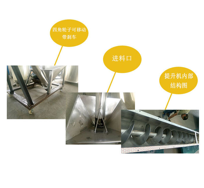 螺旋提升機(jī)產(chǎn)品概述該機(jī)適用于食品、醫(yī)藥、化工、塑料等行業(yè)的粉粒狀物料的輸送。可以與我司包裝機(jī)配套實(shí)現(xiàn)料位跟蹤自動(dòng)供料,也可單獨(dú)在其它場(chǎng)合使用。除電機(jī)、軸承、機(jī)架外其余為不銹鋼制成。可隨意移動(dòng),在水平、傾斜、垂直等位置均能連續(xù)輸送,它具有良好的密封性,無(wú)粉塵泄漏。可直接與其配套的設(shè)備連接固定,不需要地基基礎(chǔ),充分利用廠房空間。
